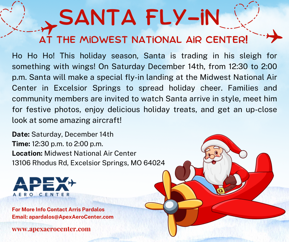 Santa is making a special stop at three of our Apex Aero Center locations this holiday season spreading holiday cheer on December 14th! He’s expected to arrive at Platteville Municipal Airport in Platteville, WI from 9:00 - 10:30 a.m.; Guthrie-Edmond Regional Airport in Guthrie, OK from 10:00 a.m. - 12:00 p.m. and the Midwest National Air Center in Excelsior Springs, MO from 12:30 - 2:00 p.m. We are excited to share our love of aviation with our community’s so come ready to see some fun aircraft, take pictures with Santa, and enjoy festive snacks!